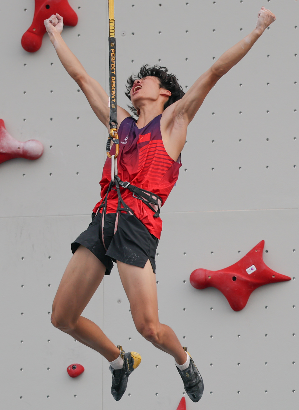 8月14日,中国选手储守宏在金牌赛后庆祝夺冠。新华社记者 陈诚 摄